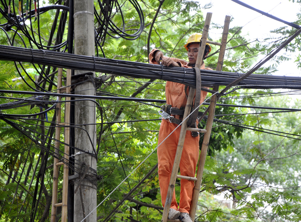 Công nhân Điện lực đang thu gọn lại cáp viễn thông, thông tin để hạn chế tai nạn khi bão số 5 đổ bộ vào. Ảnh: Ngọc Thọ