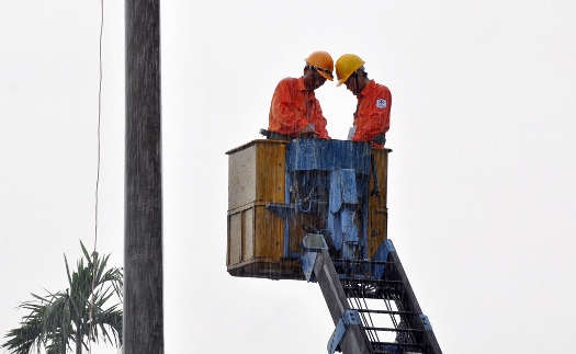 Công nhân EVN NPC vẫn đang khắc phục sự cố lưới điện trong mưa bão (Ảnh: Ngọc Thọ)
