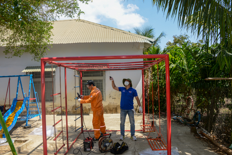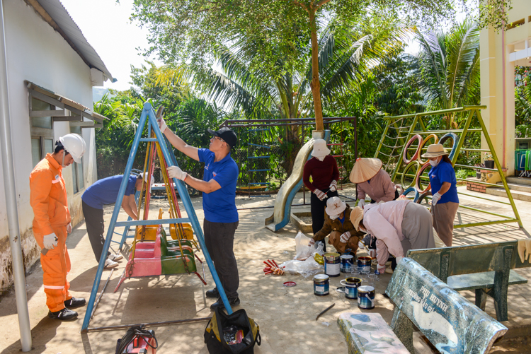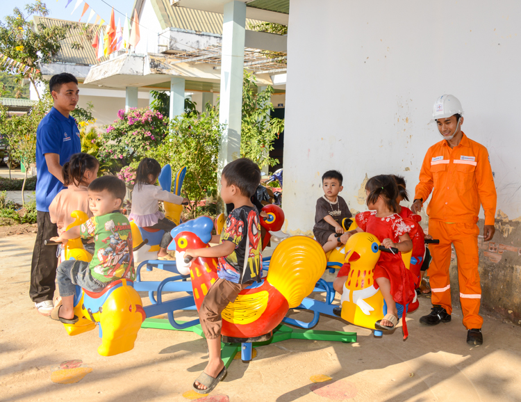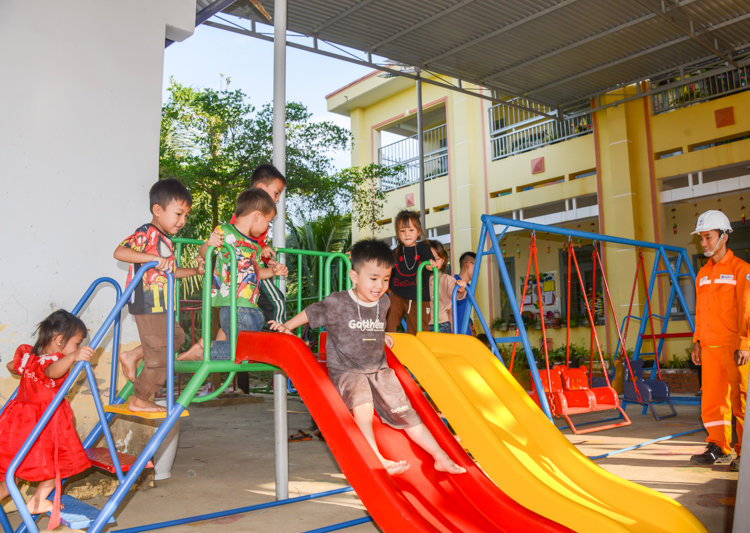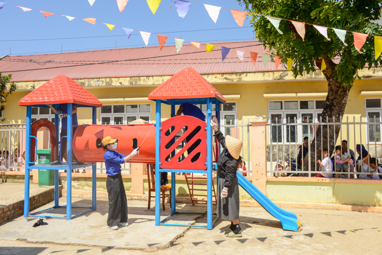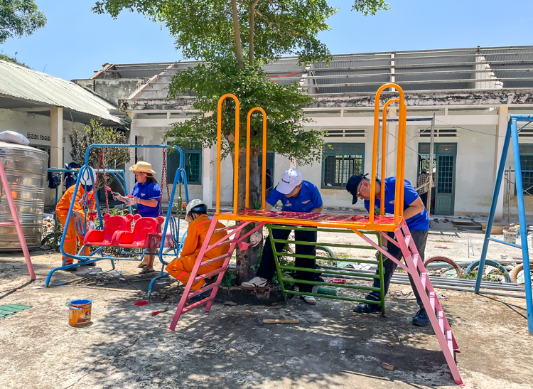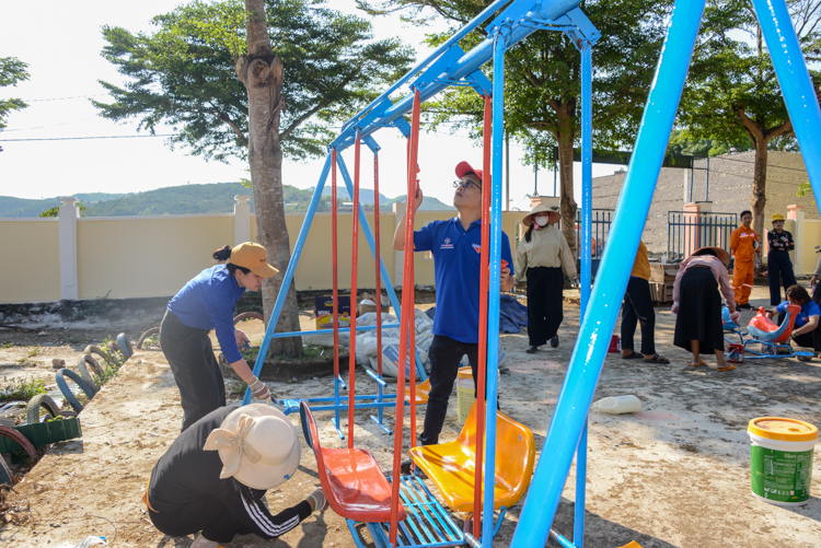 Xuất phát từ thực tế đó, Công trình Thanh niên “Sân chơi cho em” đã được triển khai với nhiều hạng mục thiết thực, hướng đến mục tiêu cải thiện môi trường học tập, sinh hoạt cho các em học sinh. Cụ thể, chương trình đã trang bị các thiết bị, đồ chơi ngoài trời như: cầu trượt, đu quay, máng trượt…, góp phần tạo không gian vui chơi an toàn, lành mạnh; lắp đặt mới 10 bóng đèn năng lượng mặt trời chiếu sáng khuôn viên trường, đảm bảo điều kiện sinh hoạt và an toàn cho các em; đồng thời tổ chức sơn sửa, cải tạo các dụng cụ vui chơi hiện có, góp phần nâng cao mỹ quan và hiệu quả sử dụng