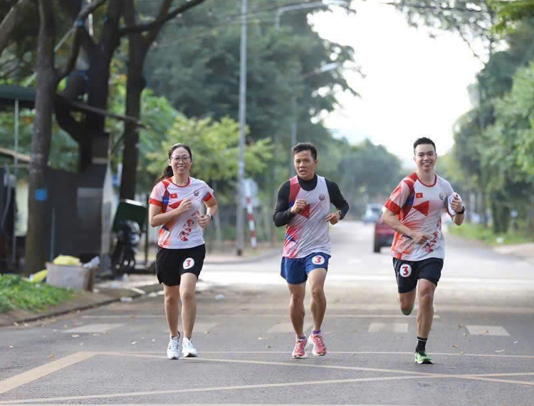 Trưởng ca vận hành Nhà máy Thủy điện Đồng Nai 3 Vàng Thanh Hưng (người ở giữa) lan tỏa phong trào Chạy bộ khi vận động người thân cùng tham gia giải chạy